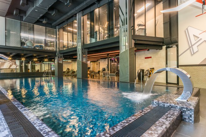 Клуб занимает два этажа. В нем есть тренажерный зал с оборудованием Life Fitness, студия йоги, персональных тренировок, современных танцев. Сердцем клуба является бассейн с 8 зонами гидромассажа, лаунж-зоной с шезлонгами и лампами «здорового загара». Гостям нравится отдыхать в сауне, марокканском хамаме, купаться в ледяном фонтане. Также вам предложат выбрать любые услуги из спа-меню, чтобы как следует расслабиться после тренировки.